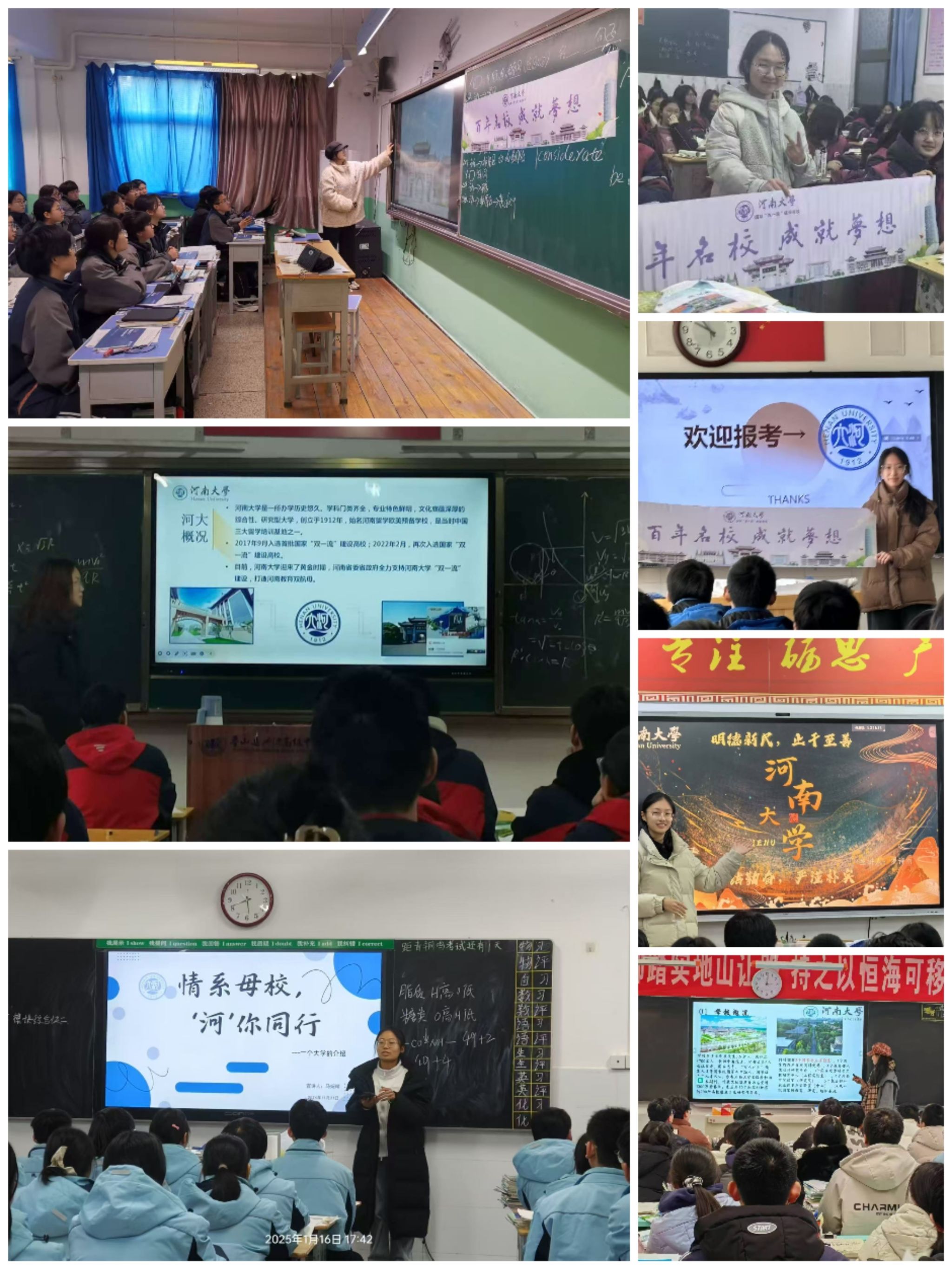 农学院24级本科生罗诗雨、马婉晴、庞思敏、魏玺逻、胡鑫雨、徐苏晴、刘柔言等分别赴母校鹿邑县高级中学、滑县第一高级中学、内乡县高级中学、鲁山县兴源高级中学、临朐中学、杞县高中、元氏县第一中学开展招生宣传。同学们纷纷表示,怀着无比激动的心情回到高中母校,介绍了河南大学的发展历史、办学特色、校园文化和学习生活,并把自己高考的经历与备考经验分享给学弟学妹们,还把报考河南大学的火苗埋藏在他们炽热的内心。在青春与青春的对望中,不仅传递着河大的底蕴,更触摸到了薪火相传的永恒温度。