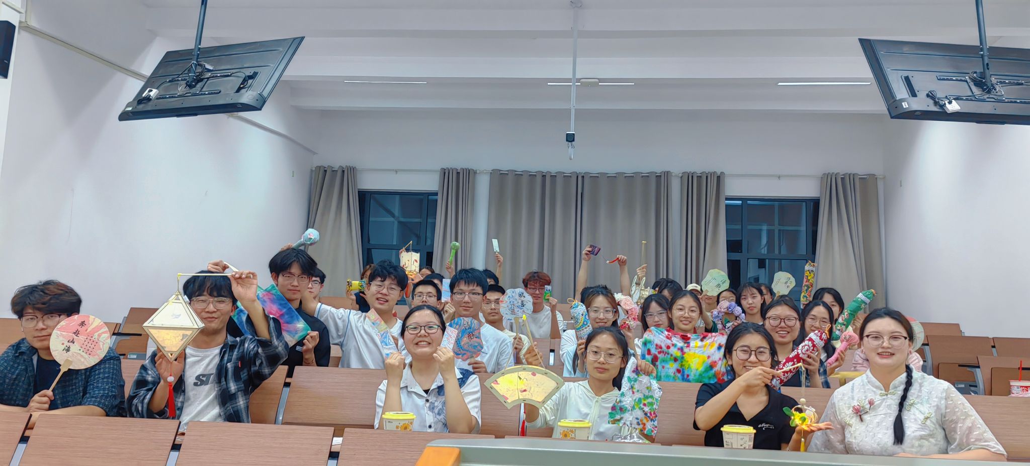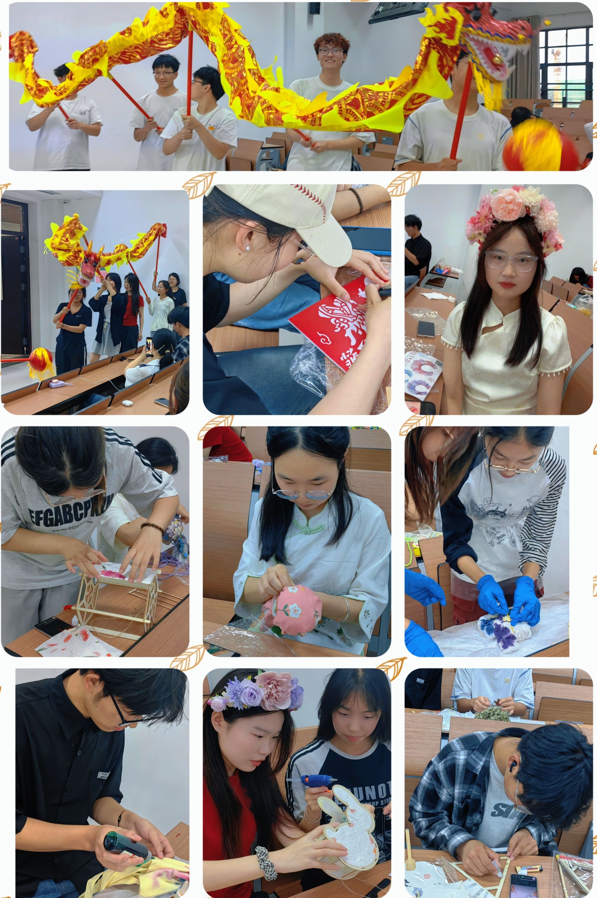 刘馨老师首先带领同学们学习了非物质文化遗产概念、重要性和表现形式,以及非遗传承人的事迹,体会传统非遗劳动的真善美,引导学生树立文化自信,增强保护和传承传统文化的意识。并以即将到来的非遗传统节日端午节为例,弘扬爱国主义精神和了解传统节日的由来和习俗。在实践环节中,同学们还学习和体验了扎染、漆扇、簪花、竹编、雕版拓印等非遗手作和舞龙传统活动。