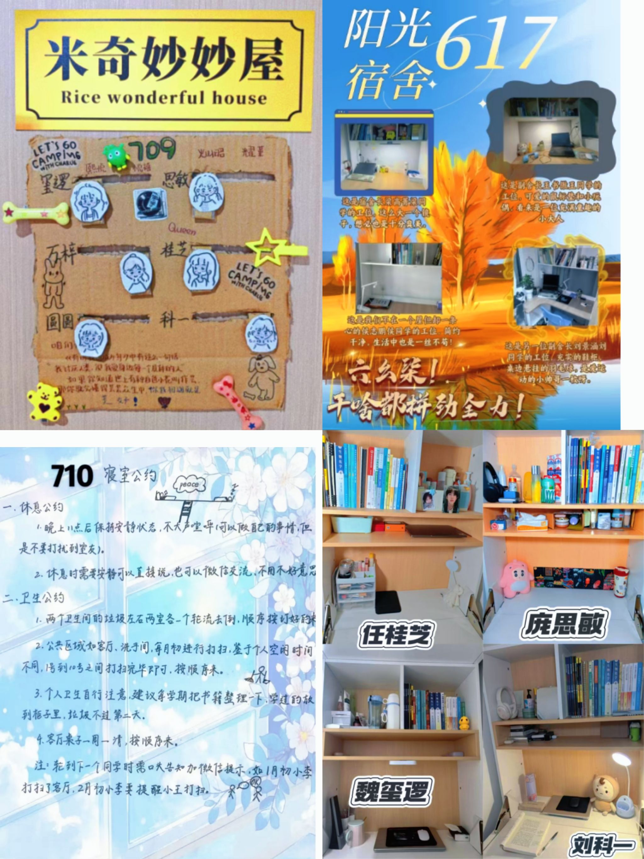 5月18日,学院在龙子湖校区开展了“舍展风华新页,净呈雅韵和光”宿舍劳动实践文化节活动。同学们按照活动方案,对个人书桌及寝室空间进行了认真打扫和整理。宿舍同学一起合理规划使用空间,灵活收纳物品,商议制定宿舍和谐公约并充分发挥想象力,团结协作设计展示各自宿舍公约的创意海报。24级本科生辅导员田海龙和刘馨两位老师依次到每个宿舍进行实地检查,并参照评比标准评选出文明宿舍七斋709和六斋615。宿舍公约海报征集结束后,通过线上教师投票和同学互投评选出优秀作品。