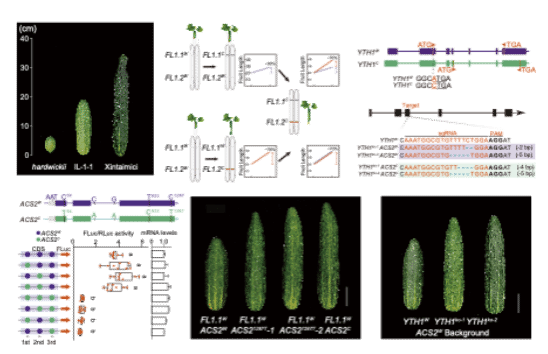 黄瓜果实长度是重要的驯化性状,直接决定黄瓜产量。黄瓜在由野生种到栽培种的驯化过程中,果实长度增加了数倍,然而遗传驯化机理仍不清楚。实验室前期通过qtl定位发现了位于1号染色体,贡献率达30%的控制果长的数量性状基因座(qtl)fl1。为了克隆目的基因,团队利用野生黄瓜(hardwickii)和栽培黄瓜(新泰密刺)构建了近等基因系群体,发现fl1控制的短瓜性状实际是由两个紧密连锁的qtl(fl1.1和fl1.2)共同决定,fl1.2对fl1.1位点的隐性上位性效应。通过固定fl1.2位点为野生等位基因,研究人员筛选了超过1万个重组单株,最终发现了在特定基因型背景下发挥作用的fl1.1的隐秘突变(cryptic variation)。fl1.2编码一个乙烯合成限速酶acs2,在野生和栽培黄瓜中acs2存在3个同义突变,2个内含子突变和1个在5'utr区的indel变异。研究将目标变异锁定在第三个外显子的1287位c>t同义突变,该单个同义突变可改变acs2的蛋白水平4-5倍。团队同时开发了适用于瓜类作物的单碱基编辑工具,将acs2野生等位基因的1287位的c编辑为t,导致acs2蛋白水平降低、黄瓜果实变长,从而直接证明了该同义突变的遗传功能(图1)。