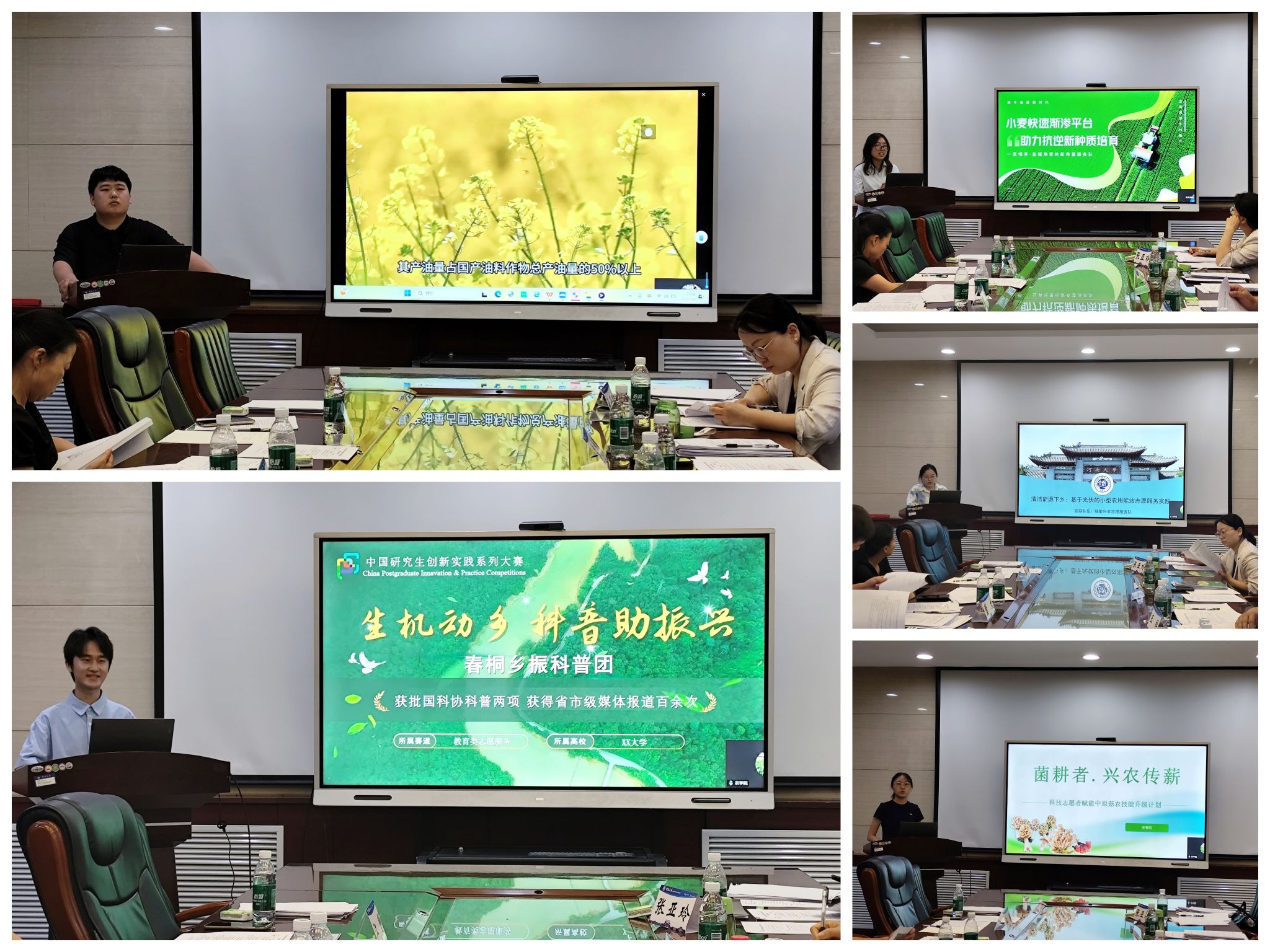 为深入贯彻落实国家乡村振兴战略,激发研究生创新实践能力与社会责任感,7月6日下午,由学校研究生院主办,农学院承办的中国研究生乡村振兴科技强农 创新大赛第二届乡村振兴志愿服务技能大赛校级选拔赛在农学院301会议室顺利举行,研究生院副院长李志芳、棉花生物育种与综合利用全国重点实验室江静教授、团委副书记董文、文学院副院长王科、地理科学学院吴娜琳副教授、哲学与公共管理学院张亚玲博士、生命科学学院25届博士研究生程祥飞担任评委。农学院执行院长王道杰、党委副书记曹玉辉出席开幕式。开幕式由王道杰主持。