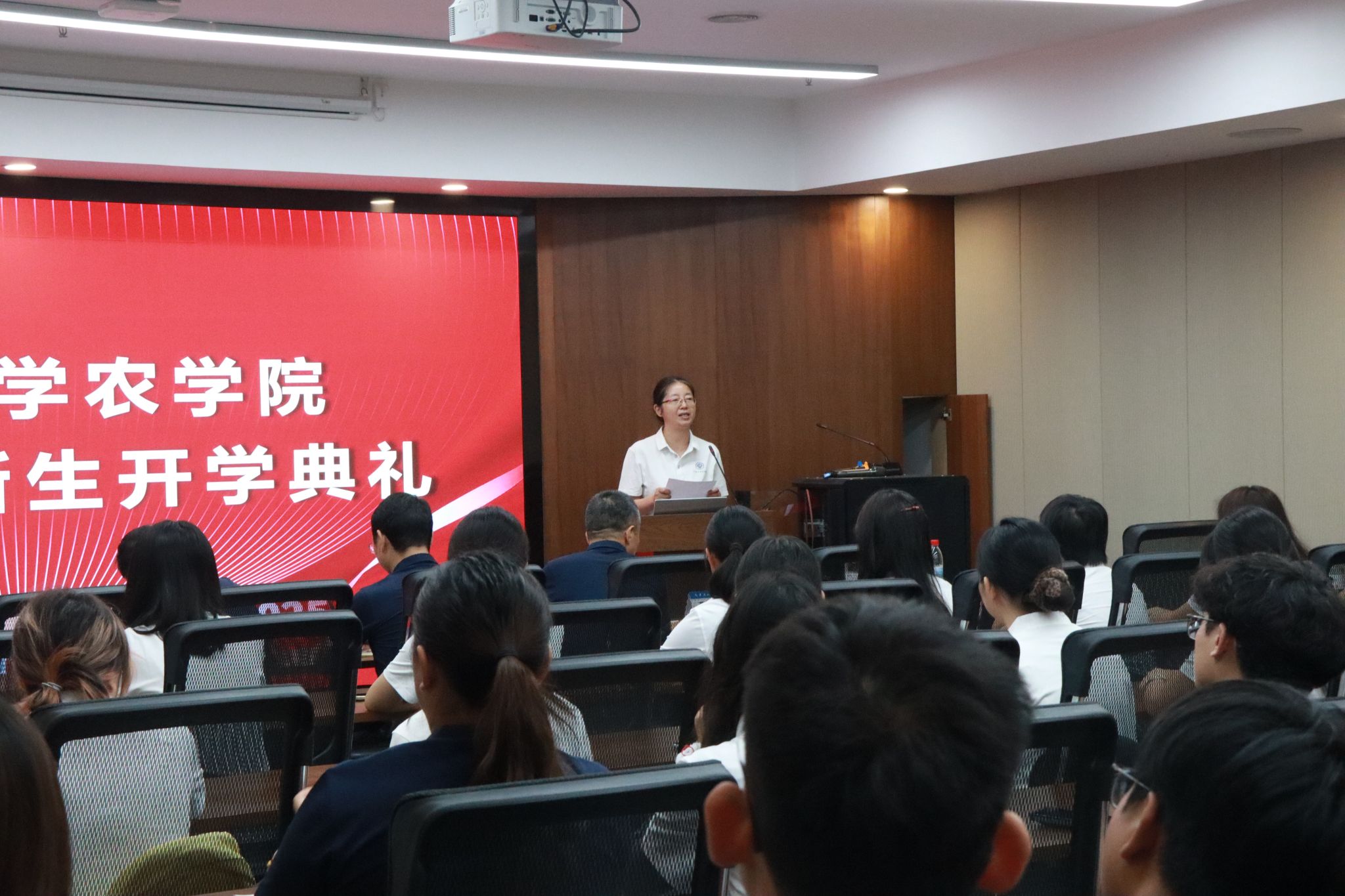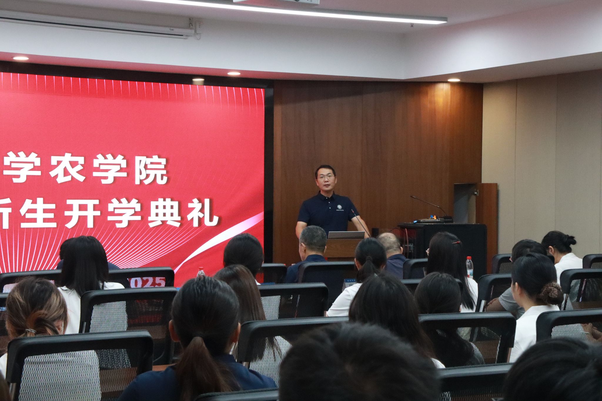 金风送爽催新穗,沃土孕苗待成长。9 月 2 日上午,农学院 2025 级学生开学典礼在省部共建作物逆境适应与改良国家重点实验室 101 会议室隆重举行。学院领导班子成员、教师代表、优秀学生代表与 2025 级全体本科生、研究生齐聚一堂,共同见证新生们逐梦农科学涯的重要时刻,携手翻开深耕农业、赋能乡村的崭新篇章。典礼由学院党委副书记曹玉辉主持。
