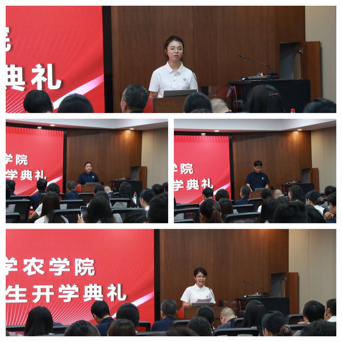 王昊洋同学与刘雨嘉同学分别作为研究生新生代表和本科生新生代表发言,他们对入学后学院无微不至的关怀表示衷心的感谢,并为老师们送去祝福。共同表达了将以学长学姐为榜样,努力学习专业知识,积极参加各类实践活动,不断提升自己的综合素质,不辜负学院和老师的期望,为农业强国贡献青春力量。