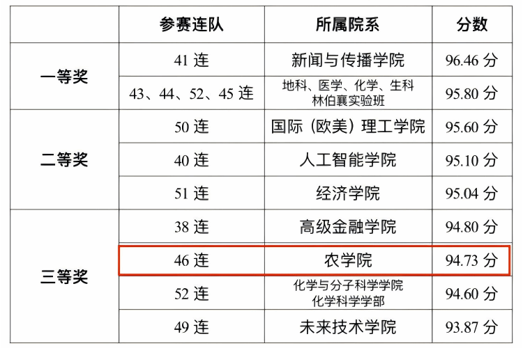 9月17日下午,河南大学纪念抗日战争暨世界反法西斯战争80周年2025级军训歌咏比赛圆满落幕。经过激烈角逐,由2025 级农学院30名本科生组成的合唱队凭借扎实的演唱功底、饱满的精神面貌和富有感染力的舞台表现,荣获龙子湖校区三等奖,为学院赢得了荣誉,展现了农学院学子昂扬向上的青春风采!