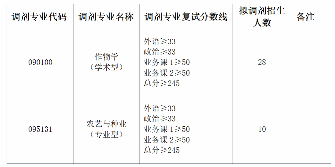 农艺与种业(095131)优先从第一志愿报考农艺与种业(095131)专业的考生中,依次按初试成绩从高到低进行调剂。若本专业的调剂生源不足,则从相近学科专业(专业代码前两位09)的考生中,依初试成绩从高到低进行调剂。